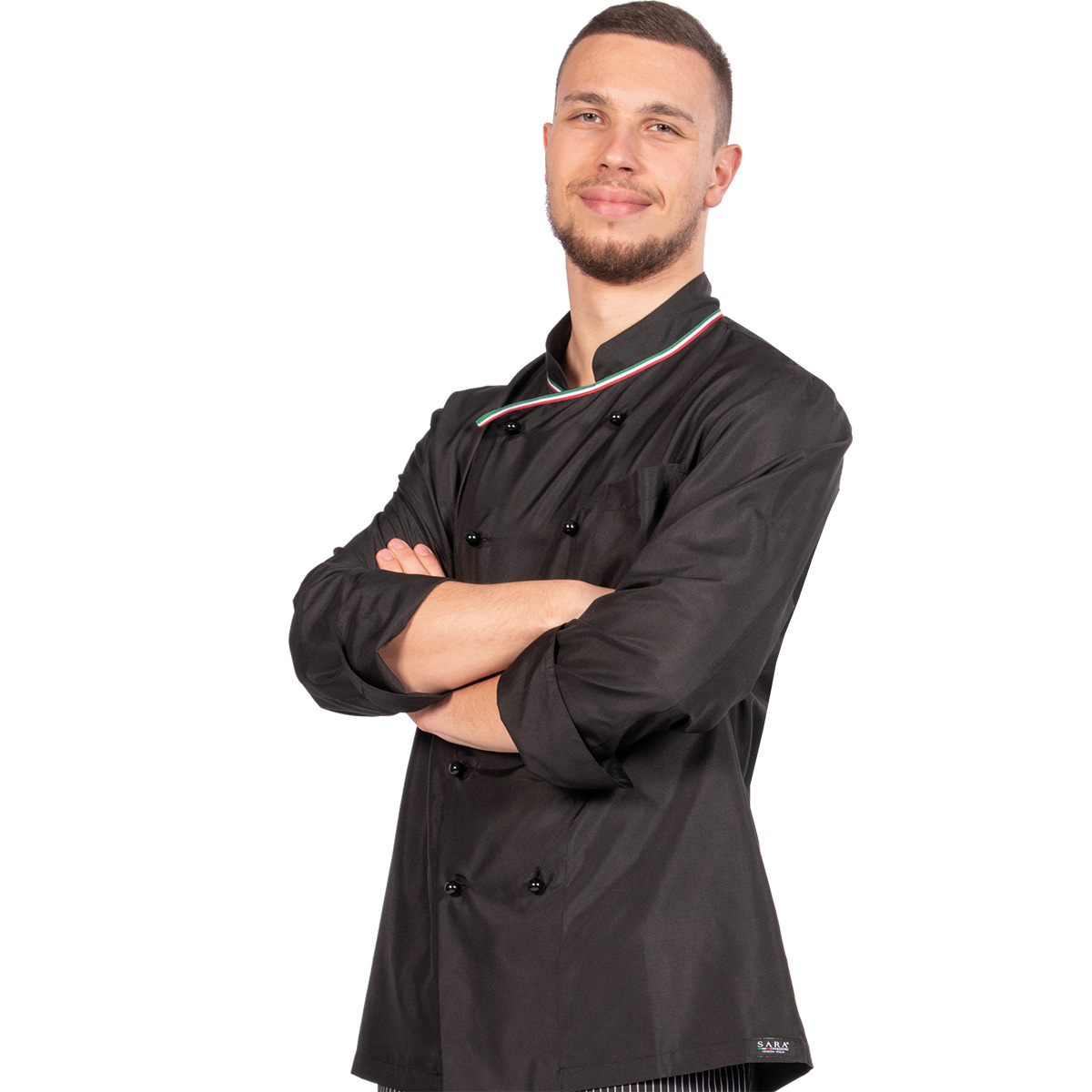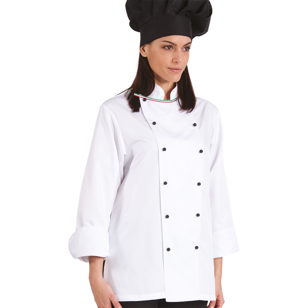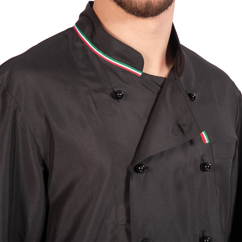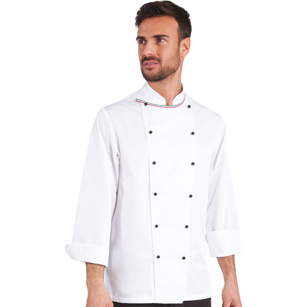 GIACCA CHEF unisex collo alla coreana con nastro โItaliaโ, tessuto leggero in microfibra, taschino lato cuore, bottoni a funghetto, spacchi laterali.
