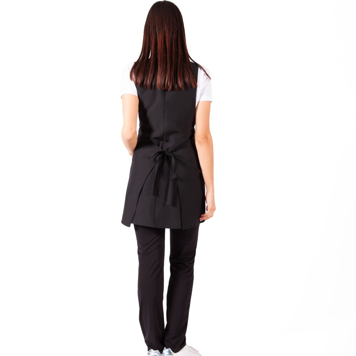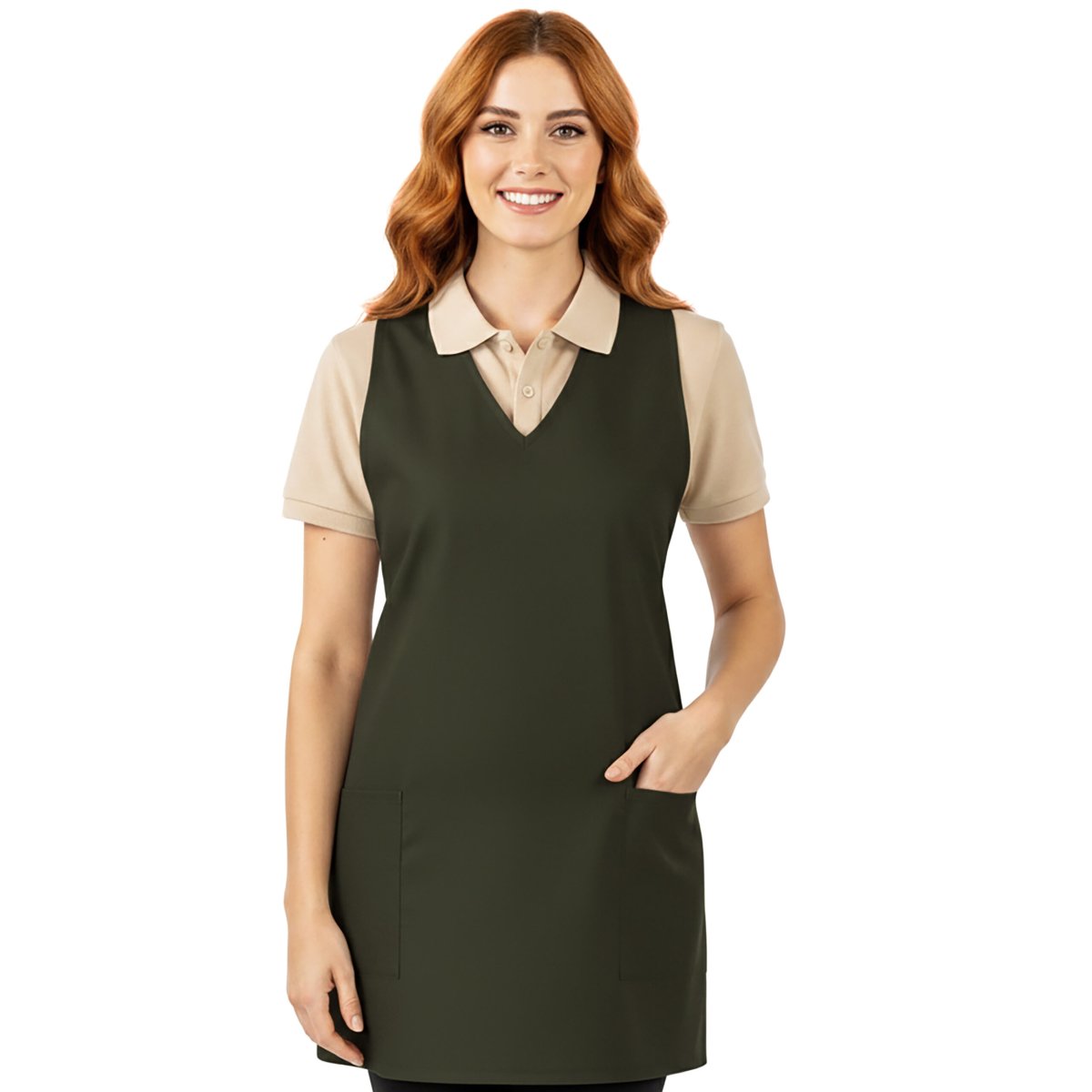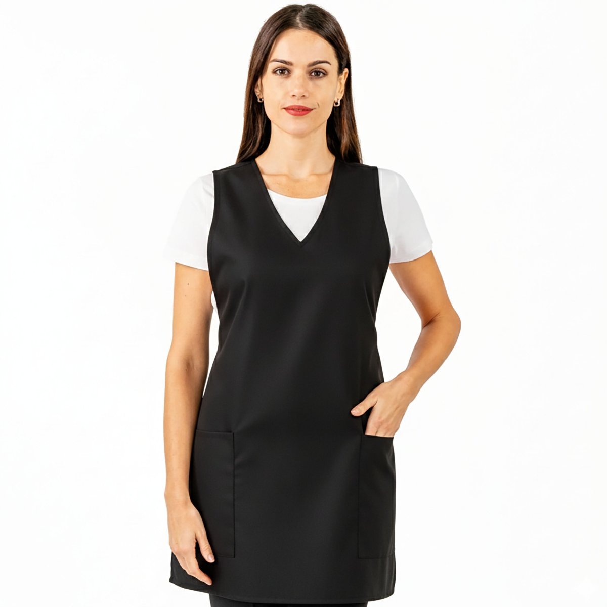 GREMBIULE A PONCHO – paragrembo donna con schiena coperta, scollo a “v”, due tasche laterali. Taglia unica regolabile con lacci. Tessuto antimacchia Candeggiabile – No stiro