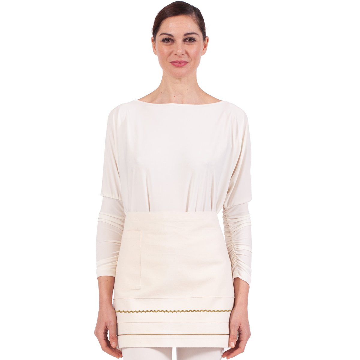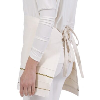 GREMBIULE – falda a vita con nervature cucite, rifiniture dorate, tessuto di canvas ad effetto grezzo e naturale. Taglia unica, vestibilitร regolabile con lacci. Tessuto antimacchia Candeggiabile – Linea natural
