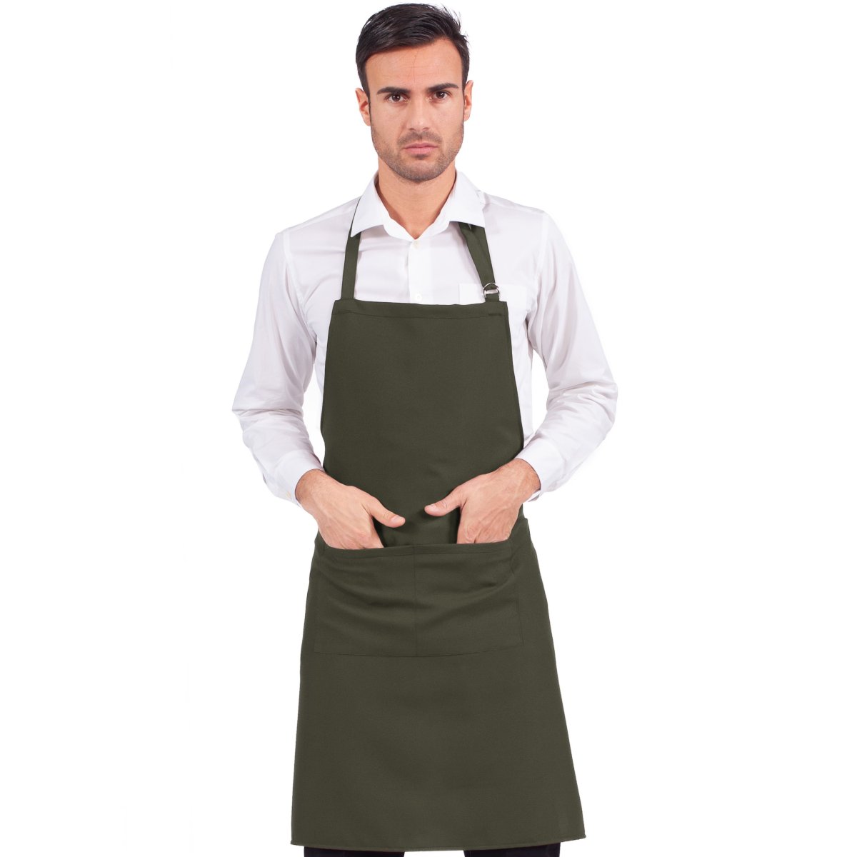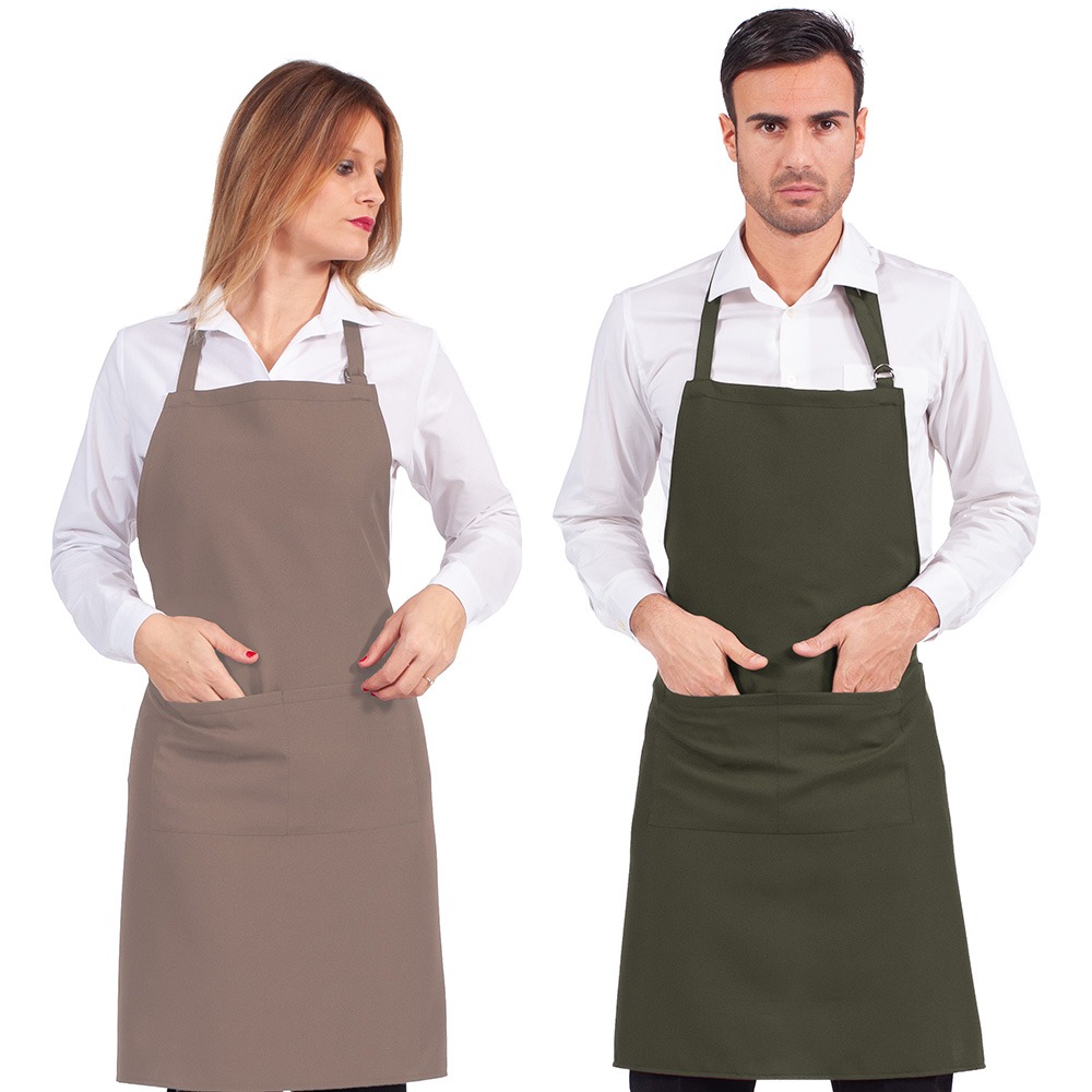 GREMBIULE CON PETTORINA – paragremboย unisex con schiena scoperta, collo regolabile con fibbia.