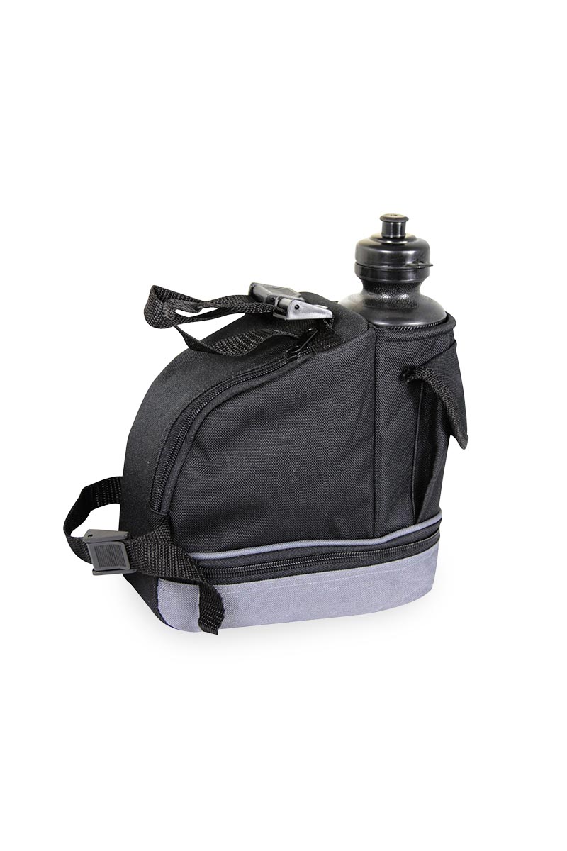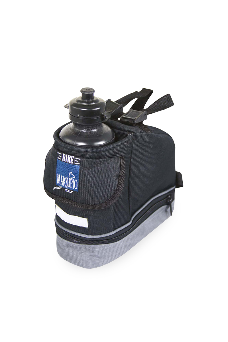 Sottosella munito di doppio scomparto, porta borraccia e porta attrezzi. Fissaggio a cinghia.