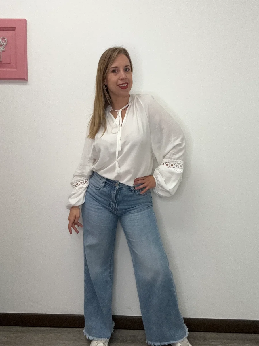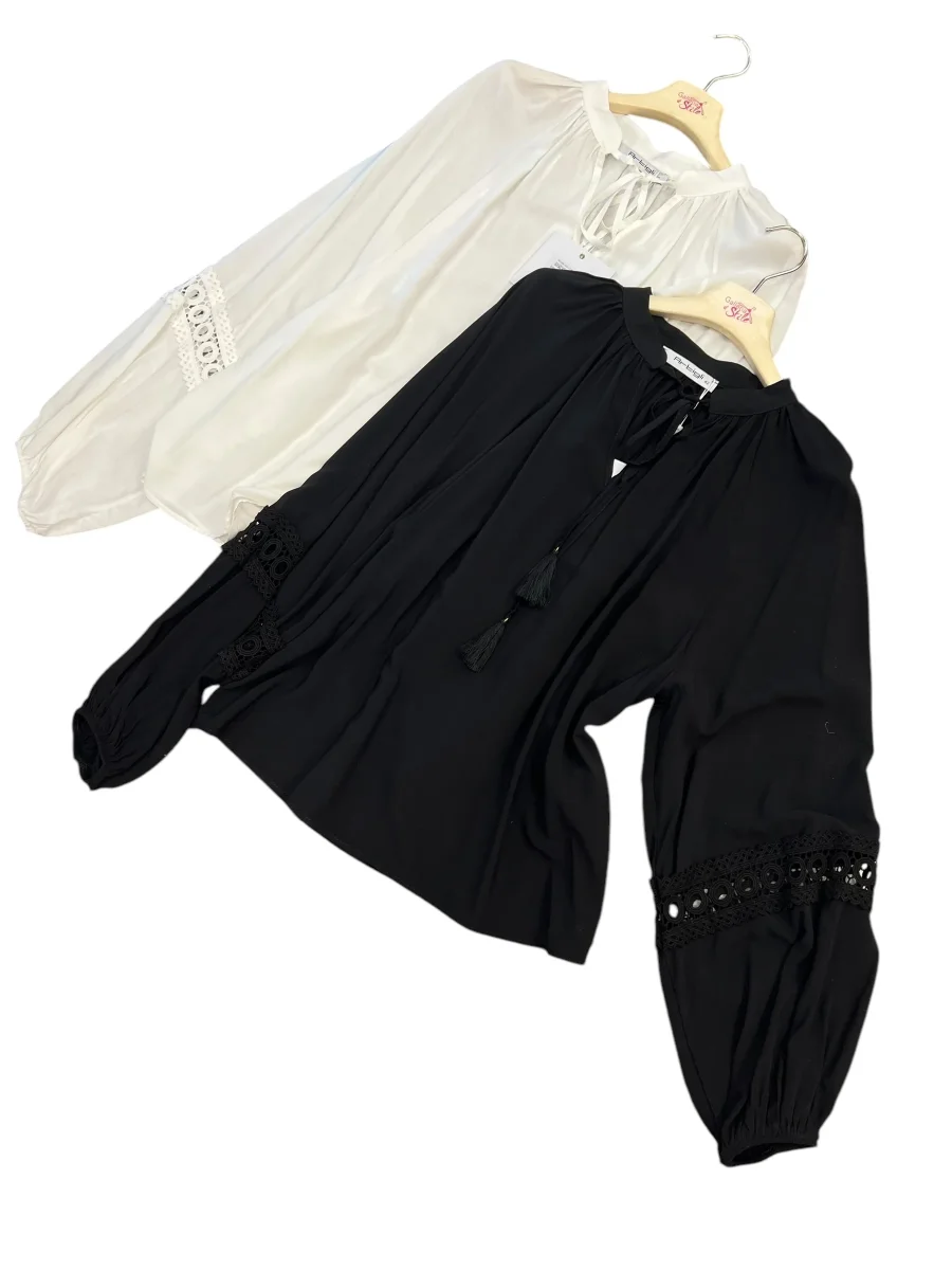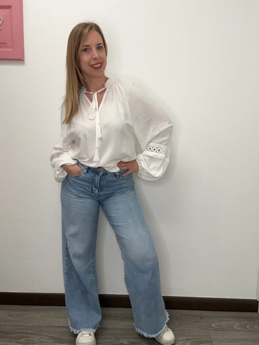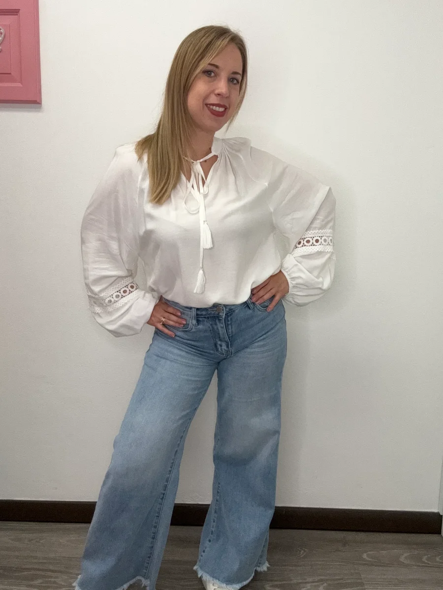 Blusa collo pistagna con macramè. Vestibilità grande