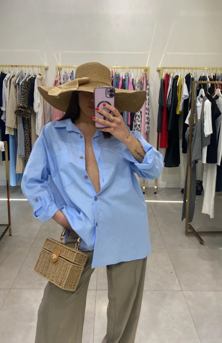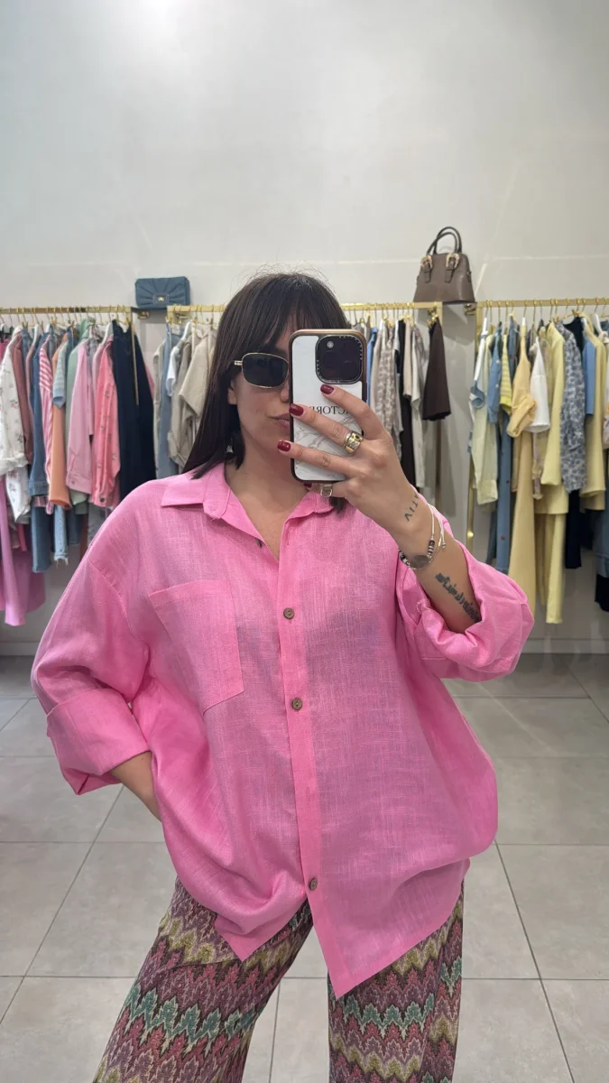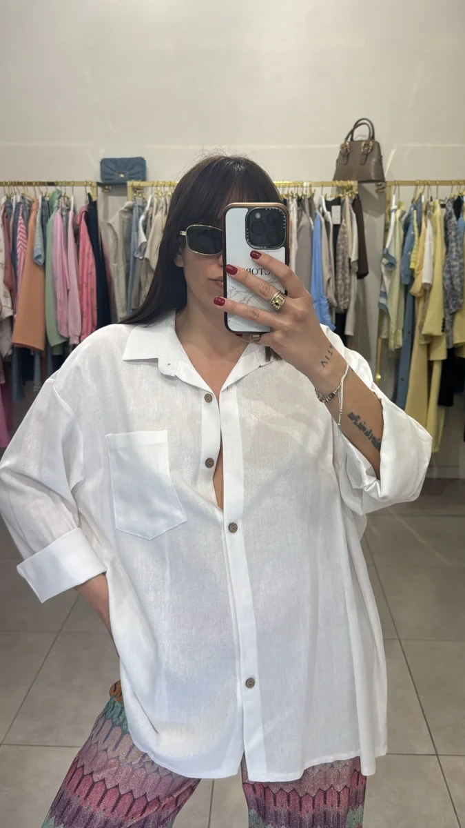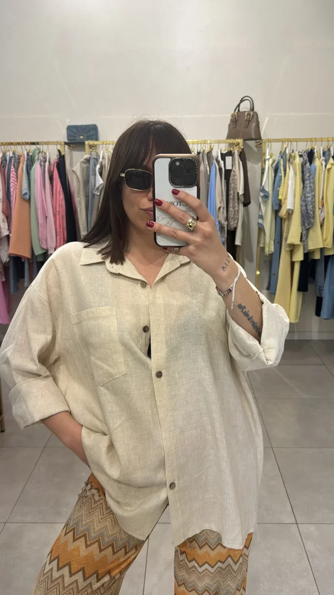 Camicia simil lino con bottoni e taschino , vestibilitร over . Veste fino ad una tg 48