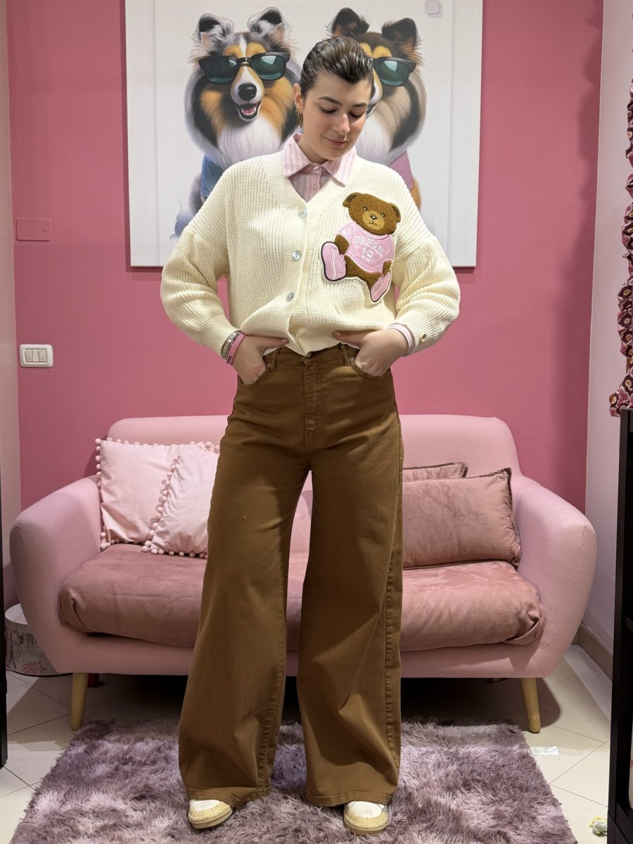 La nostra orsetta Dream applicata, che rende ogni cardigan speciale e immediatamente riconoscibile.