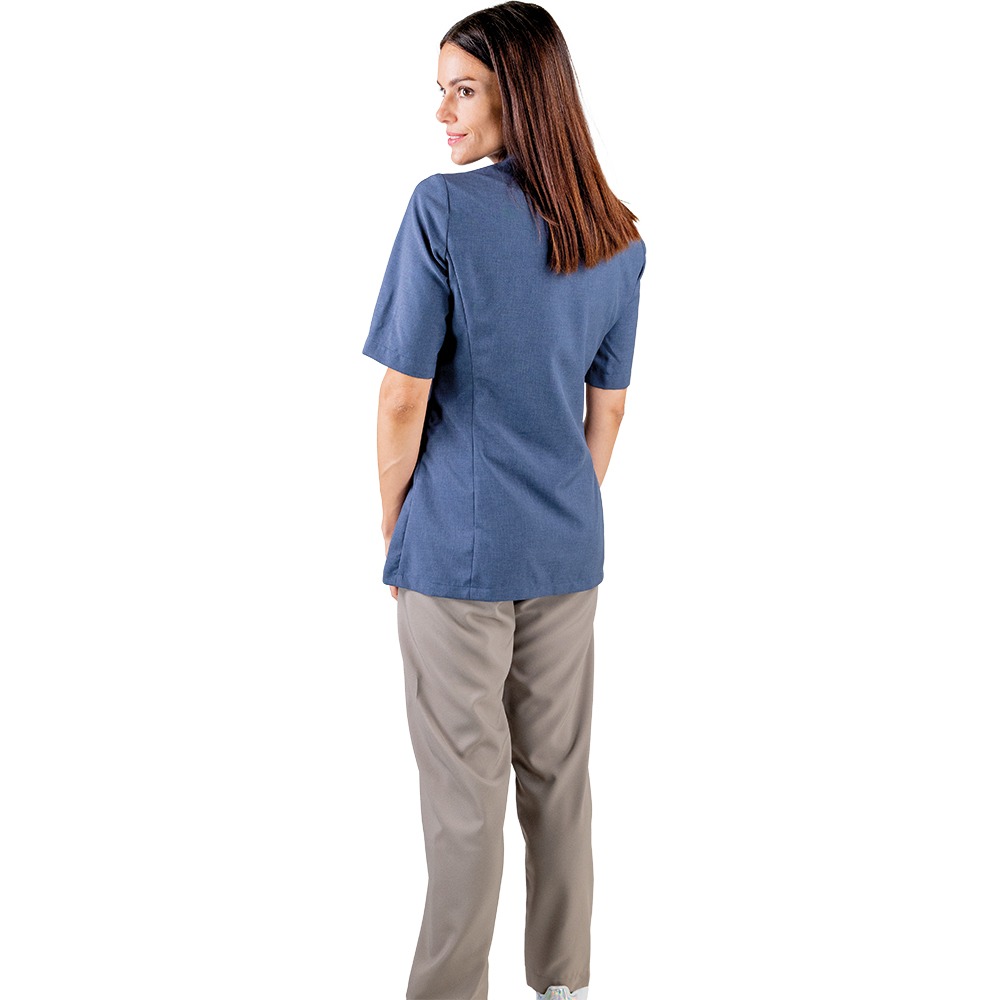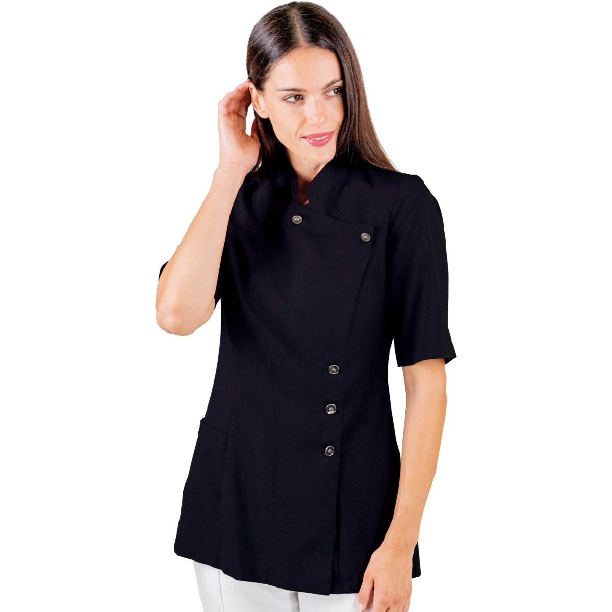 casacca donna manica corta, collo alla coreana, allacciatura laterale con bottoni, una tasca, linea sfiancata. Tessuto antimacchia candeggiabile – No stiro