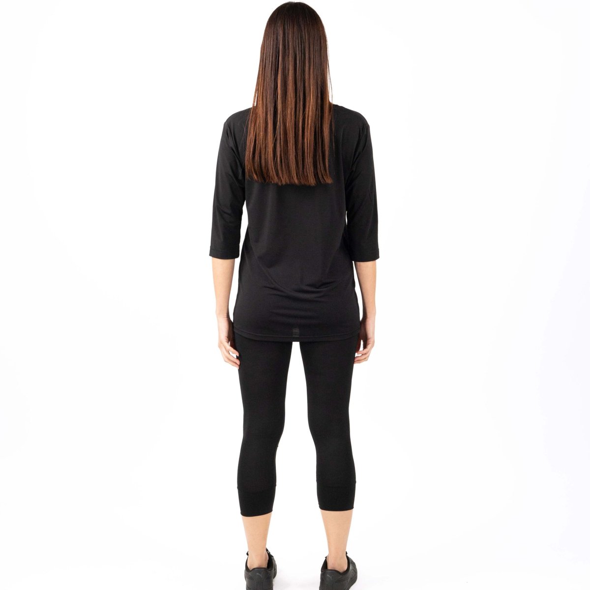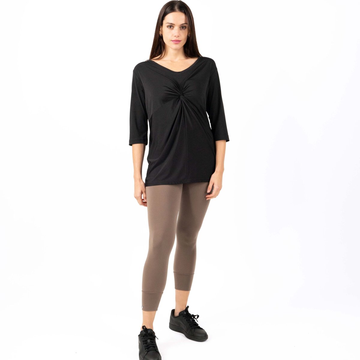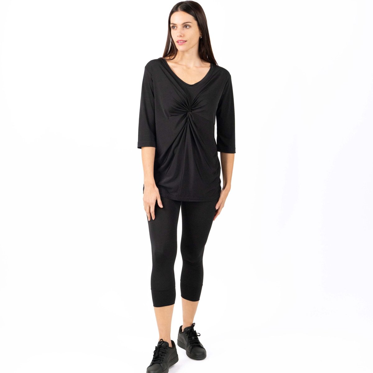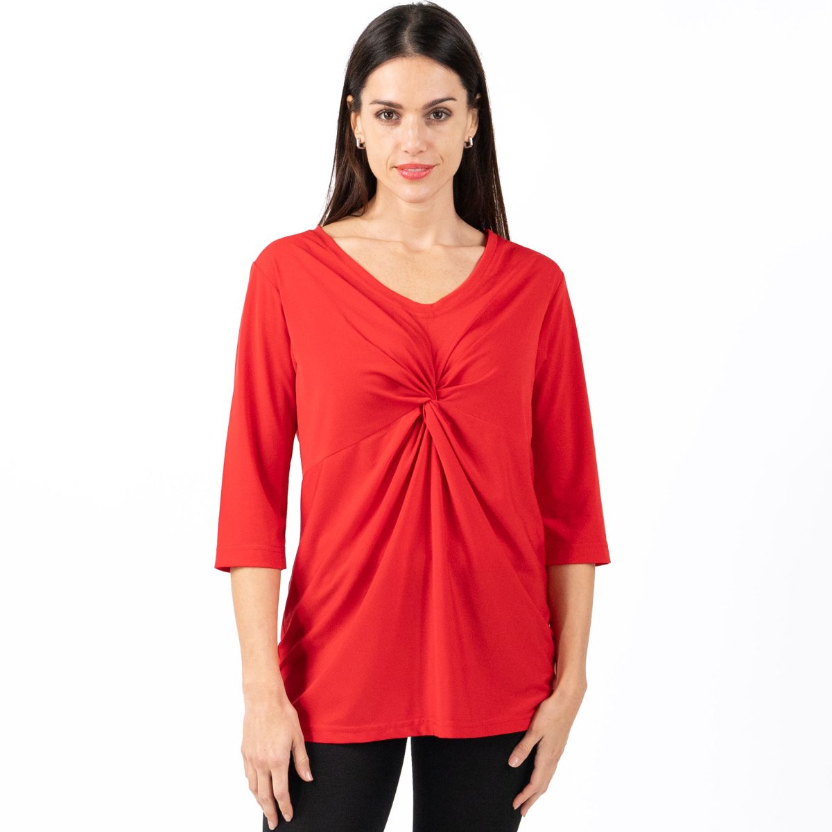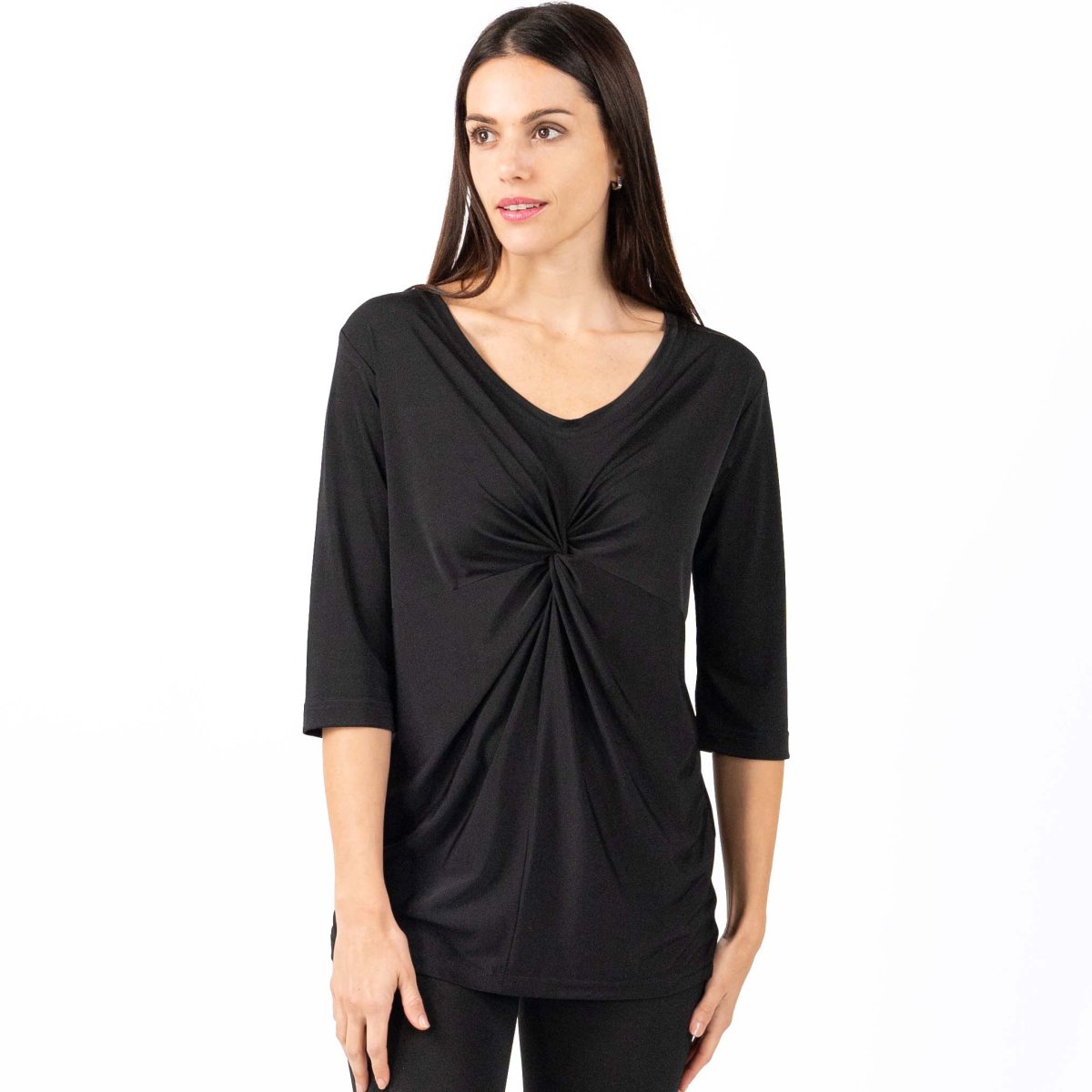 MAGLIA donna in jersey, manica 3/4 e colloย a “v” con nodo drappeggiato. Nero: Tessuto antimacchia Candeggiabile โ No stiro Altri colori: Tessuto Candeggiabile โ No stiro