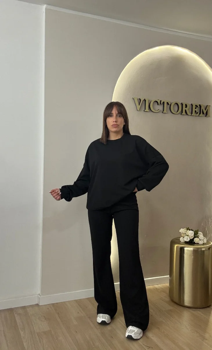 Coordinato tessuto garzato con elastico in vita e laccio, veste fino ad una tg 46
