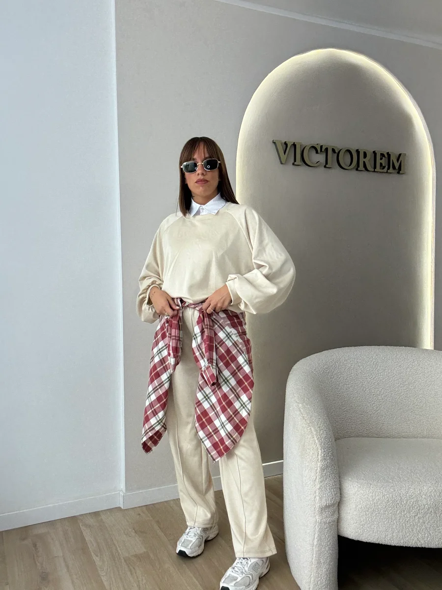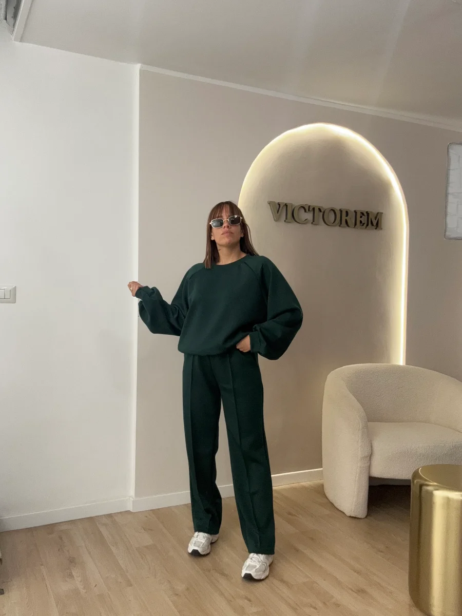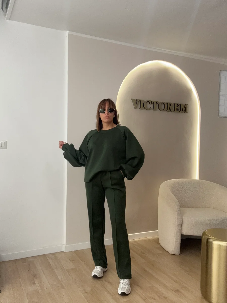 Coordinato tessuto skuba composto da pantalone totalmente elastico in vita e felpa manica lunga .