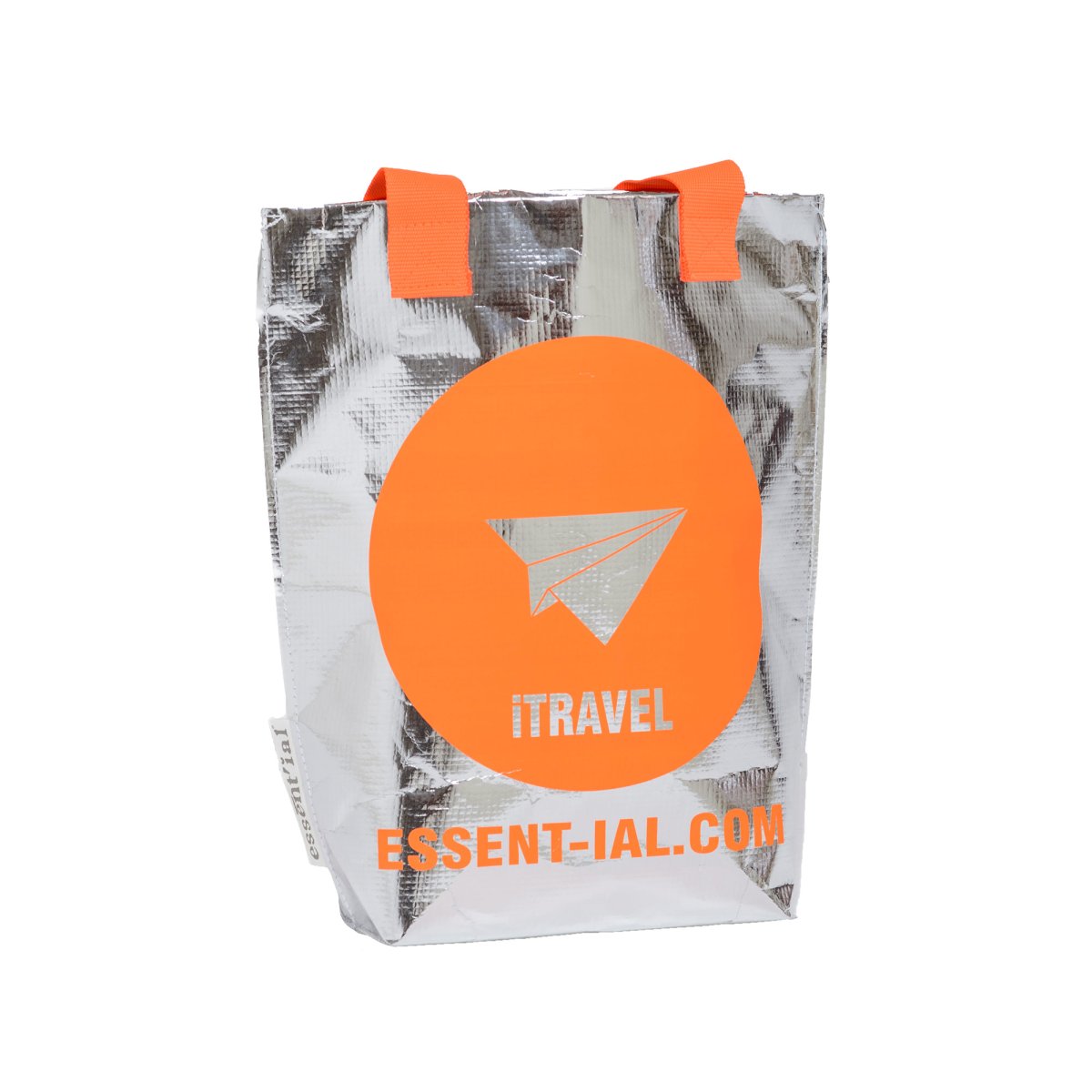Borsa/shopper realizzata in carta raffia argento con stampa arancio fluo. I manici sono realizzati in tessuto arancio fluo. Può essere usata come borsa a mano o borsa a spalla Superficie lavabile con un panno umido. Dimensioni: 33 x 10 x h. 37 cm