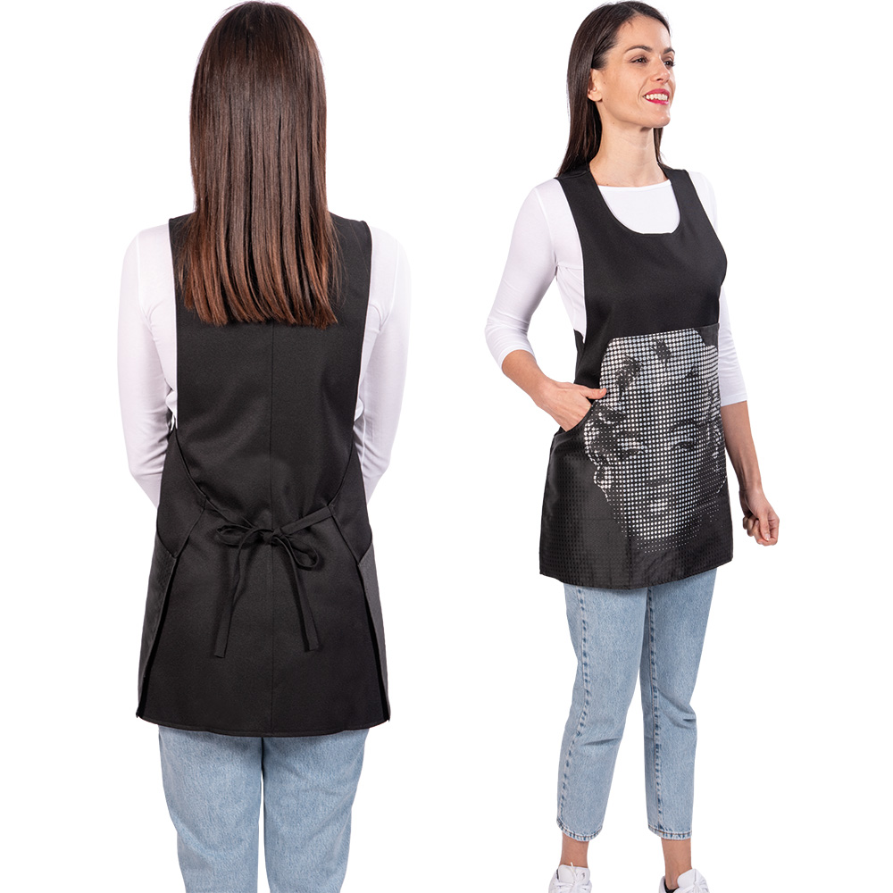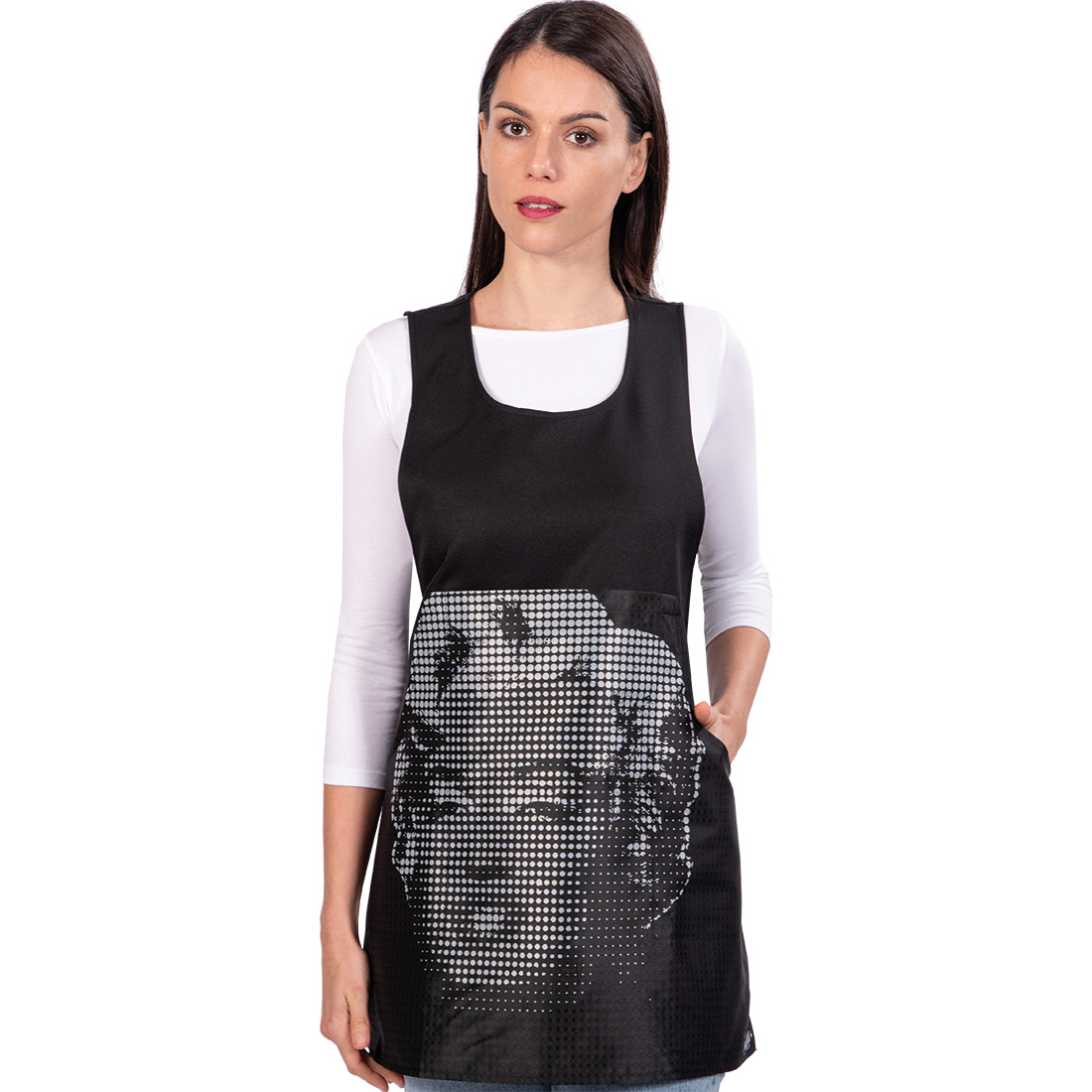 GREMBIULE A PONCHO – paragrembo donna con lavorazione jacquard “Marilyn Monroe”, schiena coperta, scollo rotondo, tasca centrale e due tasche laterali. Taglia unica, vestibilitร regolabile con lacci. Tessuto antimacchia Candeggiabile – No stiro