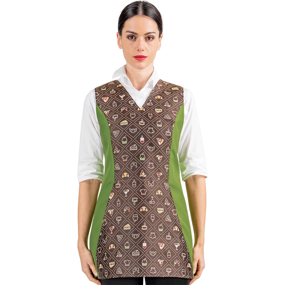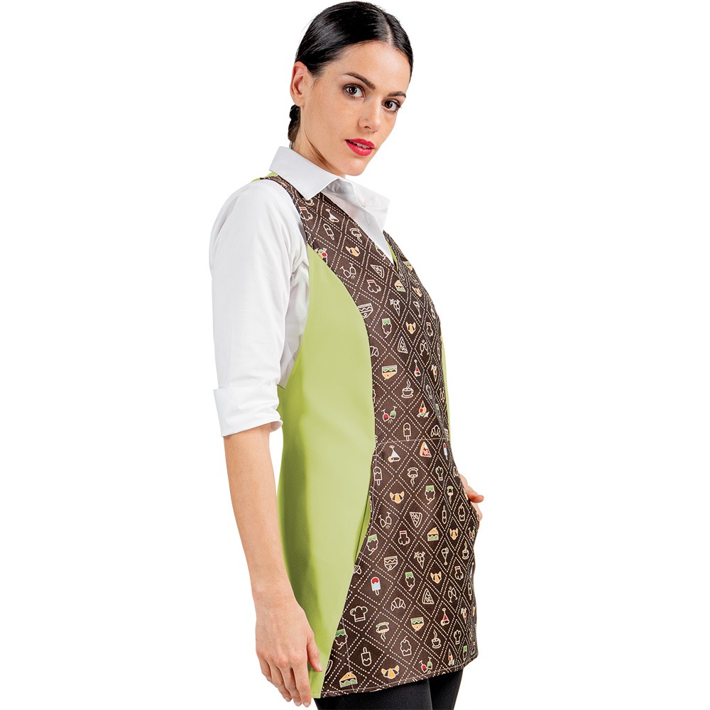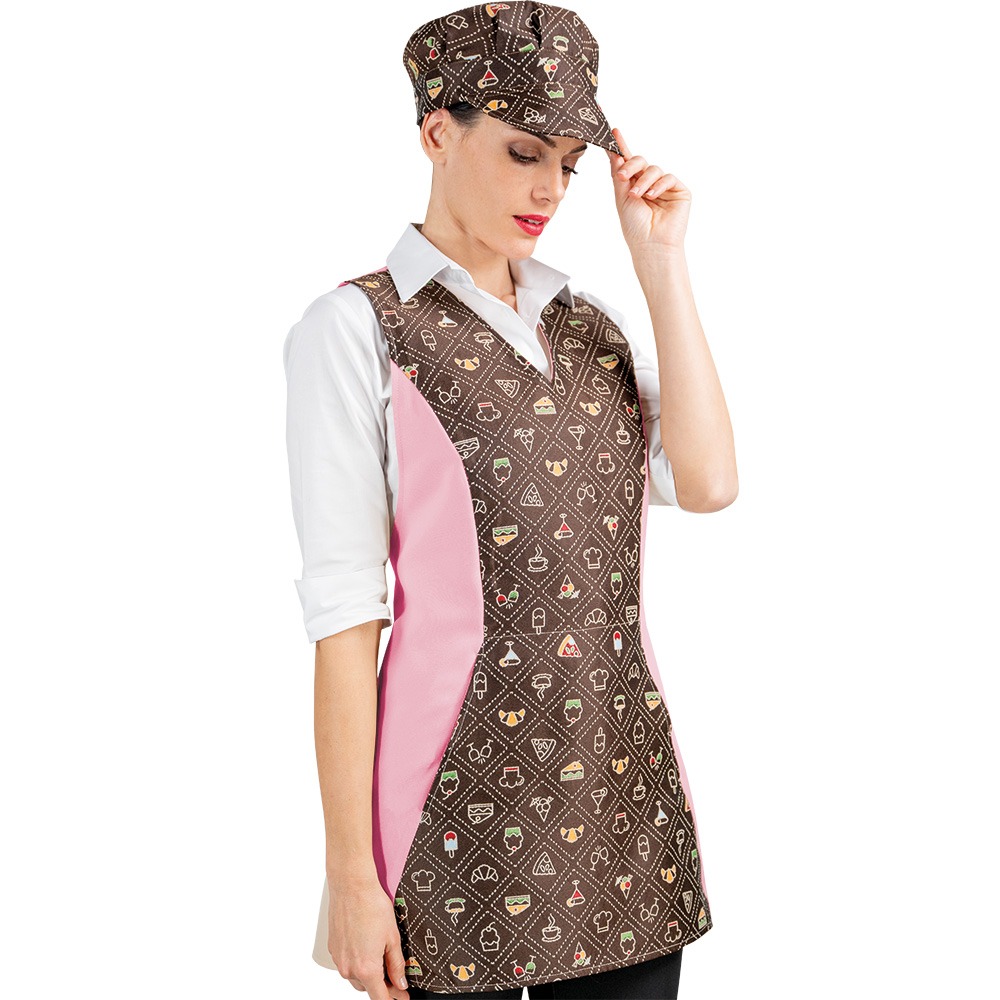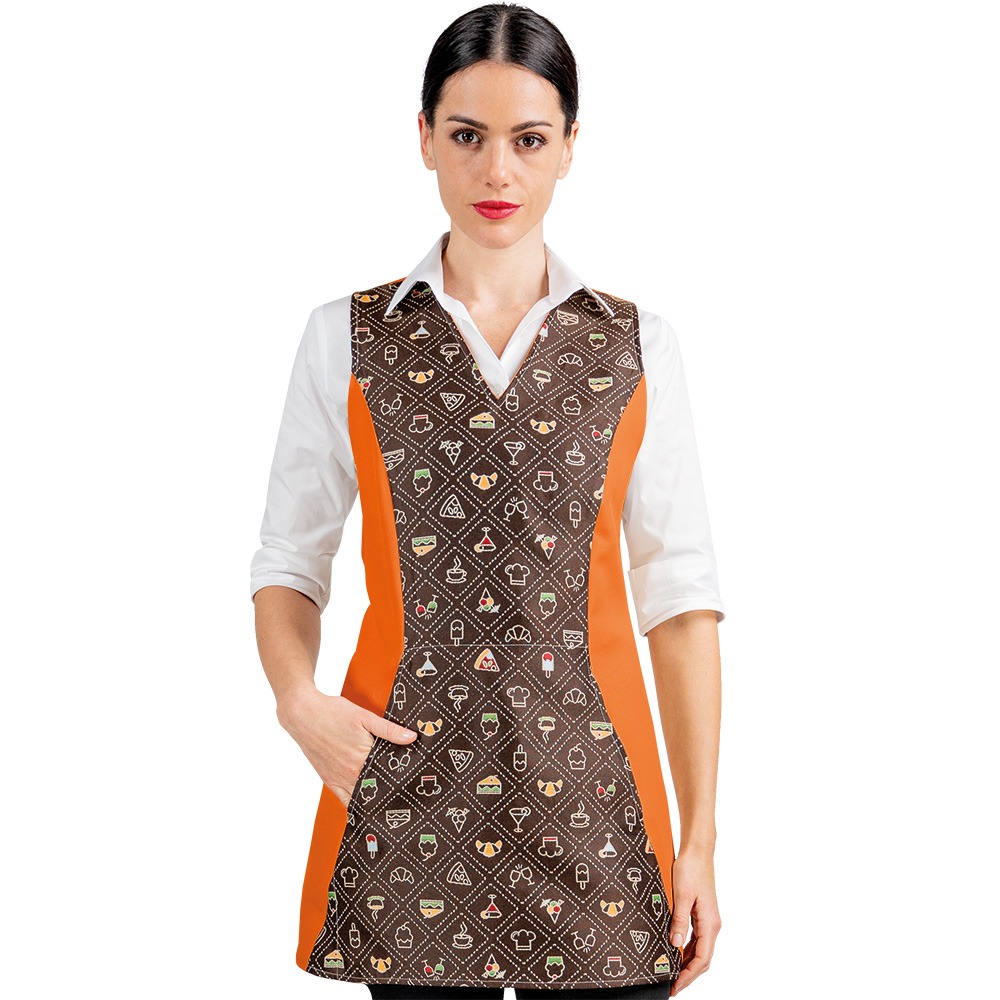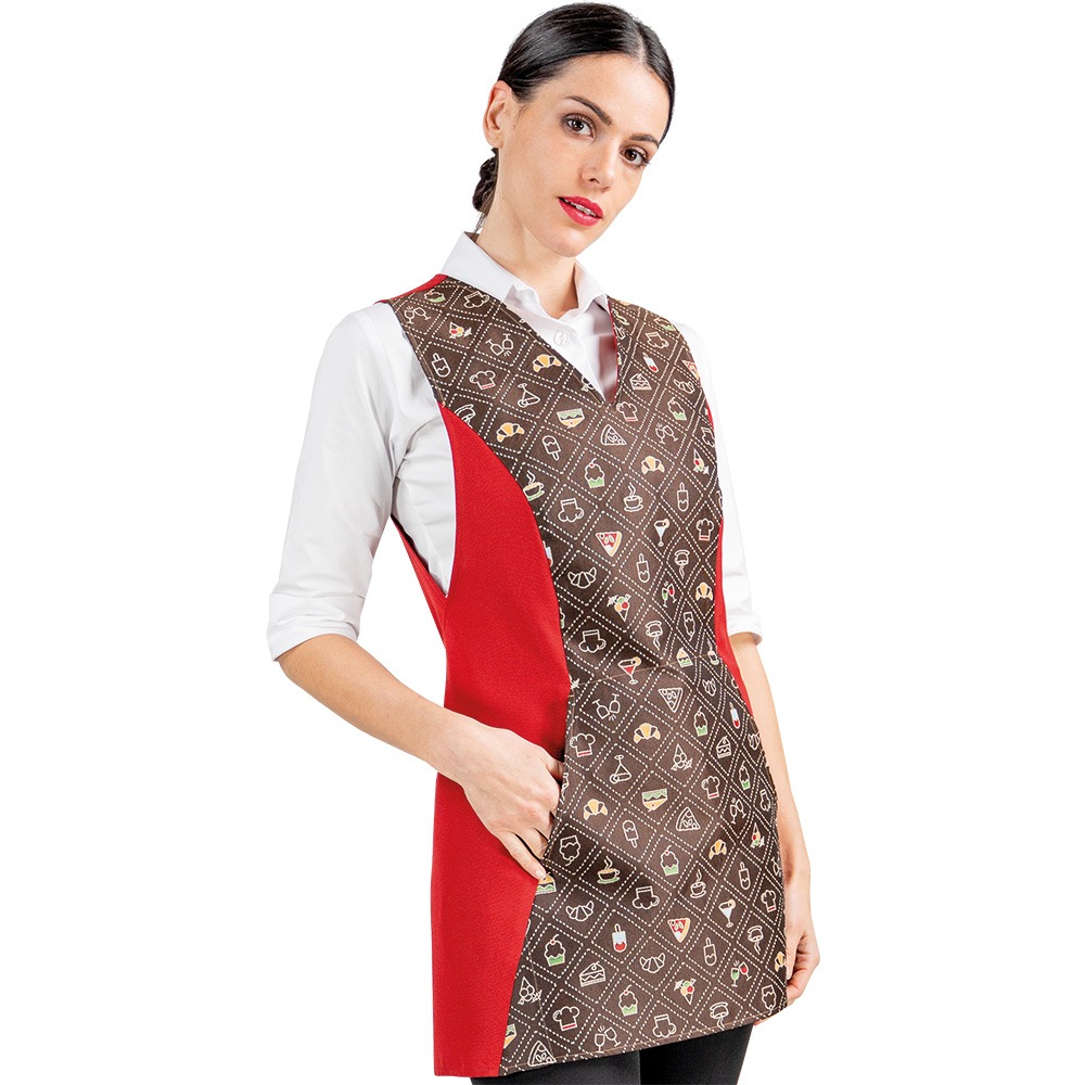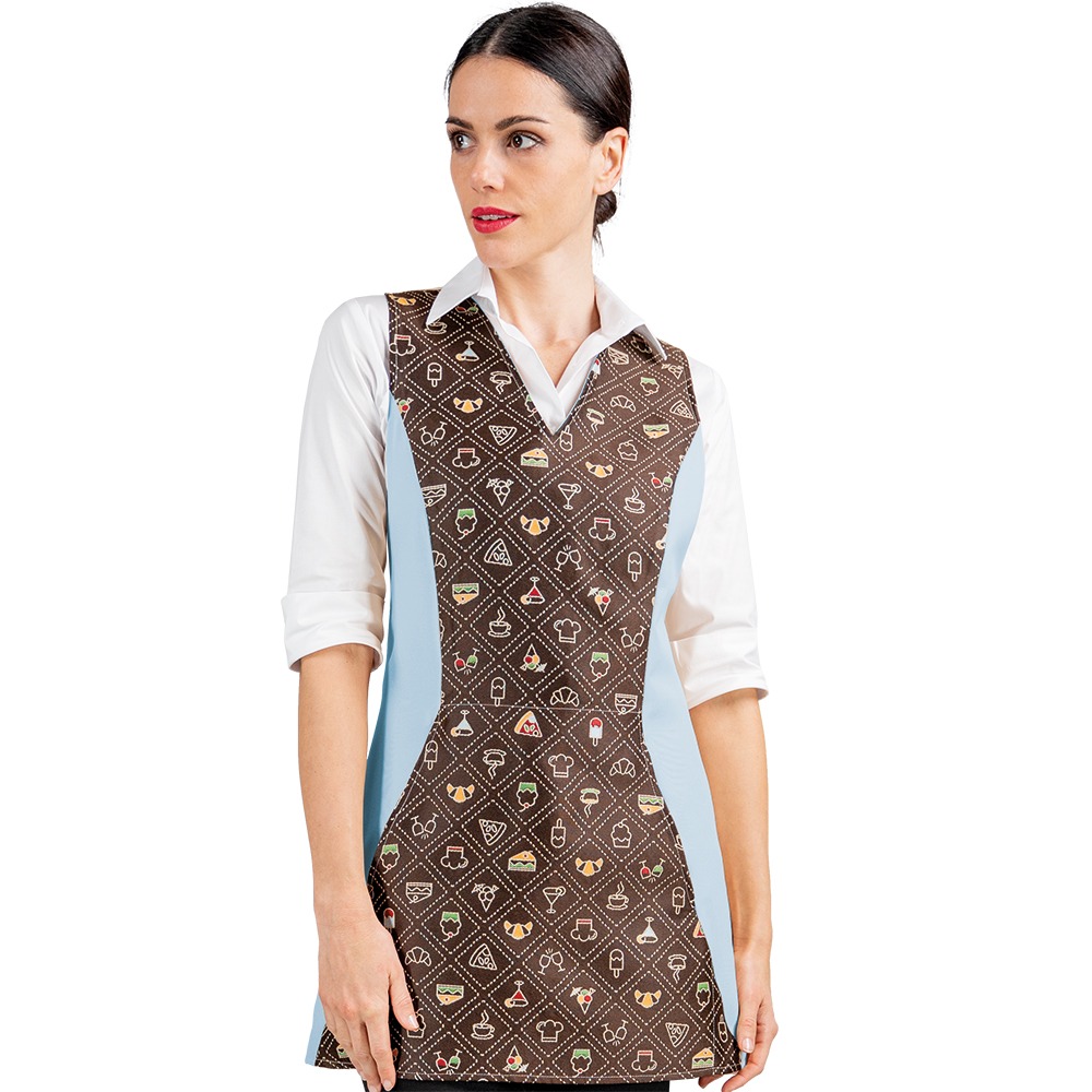 Grembiule donna con schiena coperta, in pratico tessuto antimacchia candeggiabile e no stiro. Taglia unica regolabile con lacci utili a vestire tutte le corporature.