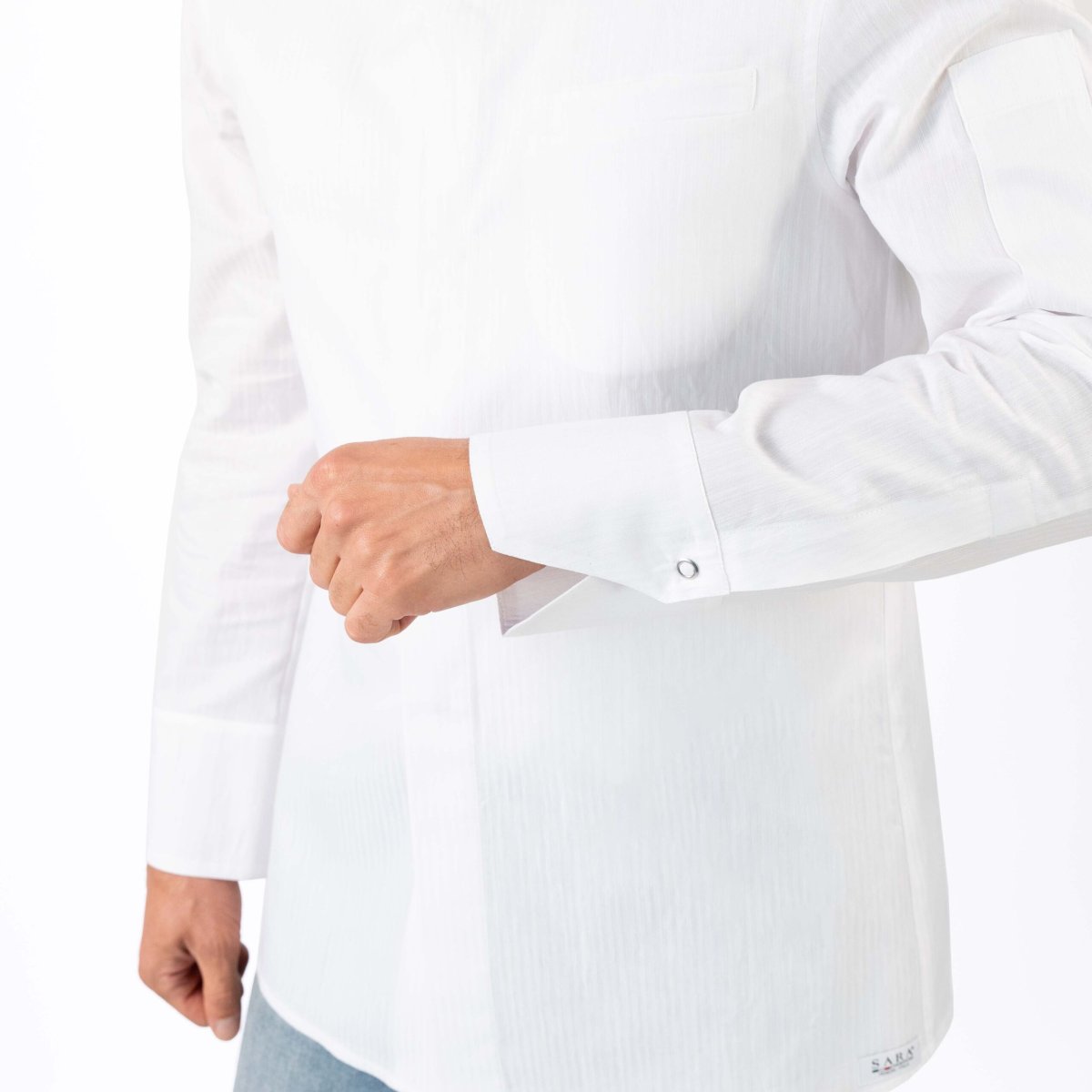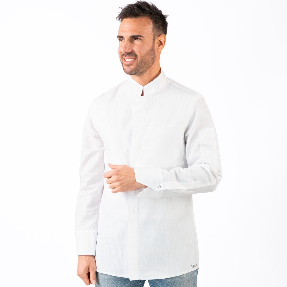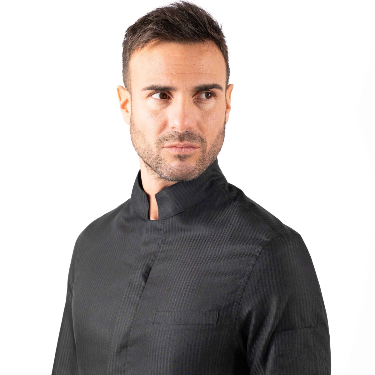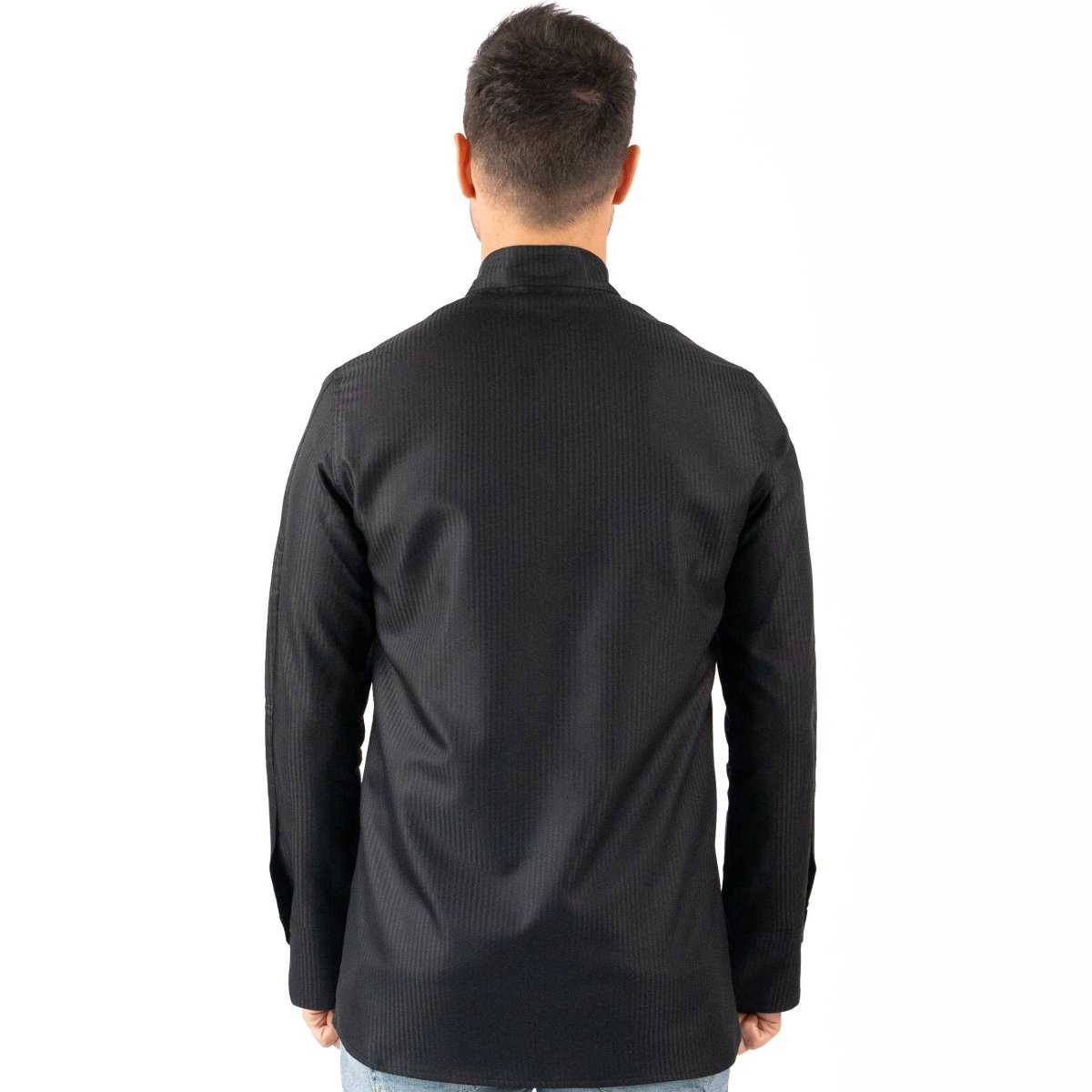 GIACCA A CAMICIA, collo alla coreana squadrato, fascetta a linea alta, taschino inserito lato cuore, allacciatura con bottoni automatici anche nei polsini. Tessuto rigatino, leggero, stiro facile.