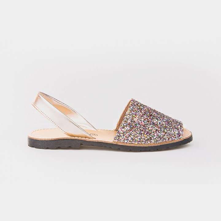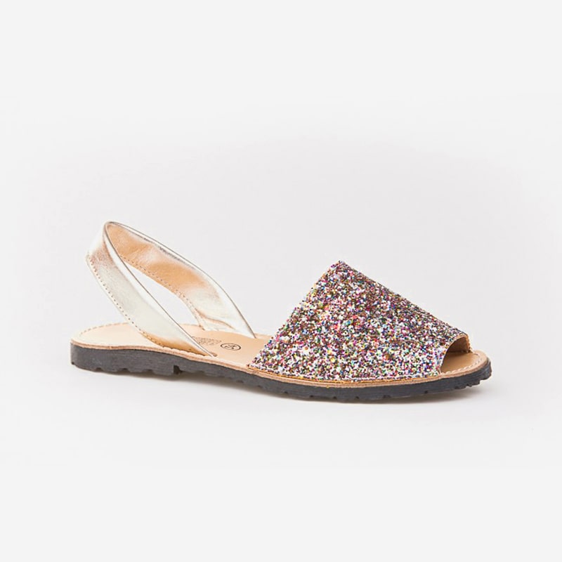 - Minorchina classica, morbida e flessibile, realizzata in nappa di cuoio bovino metalizzata e glitter. La parte interna รจ realizzata con una fodera in pelle naturale. Pianta in cuoio. Suola in gomma antiscivolo