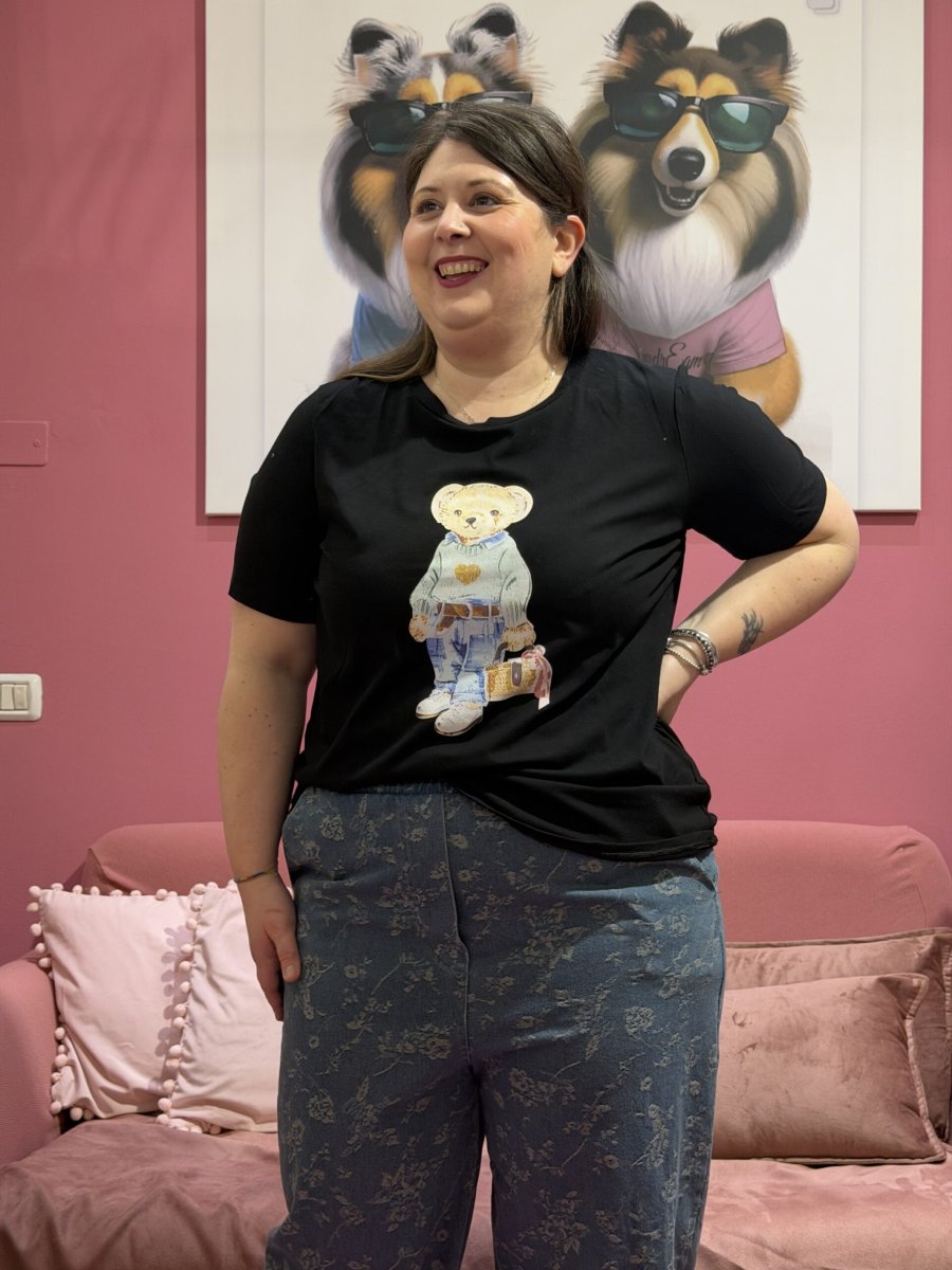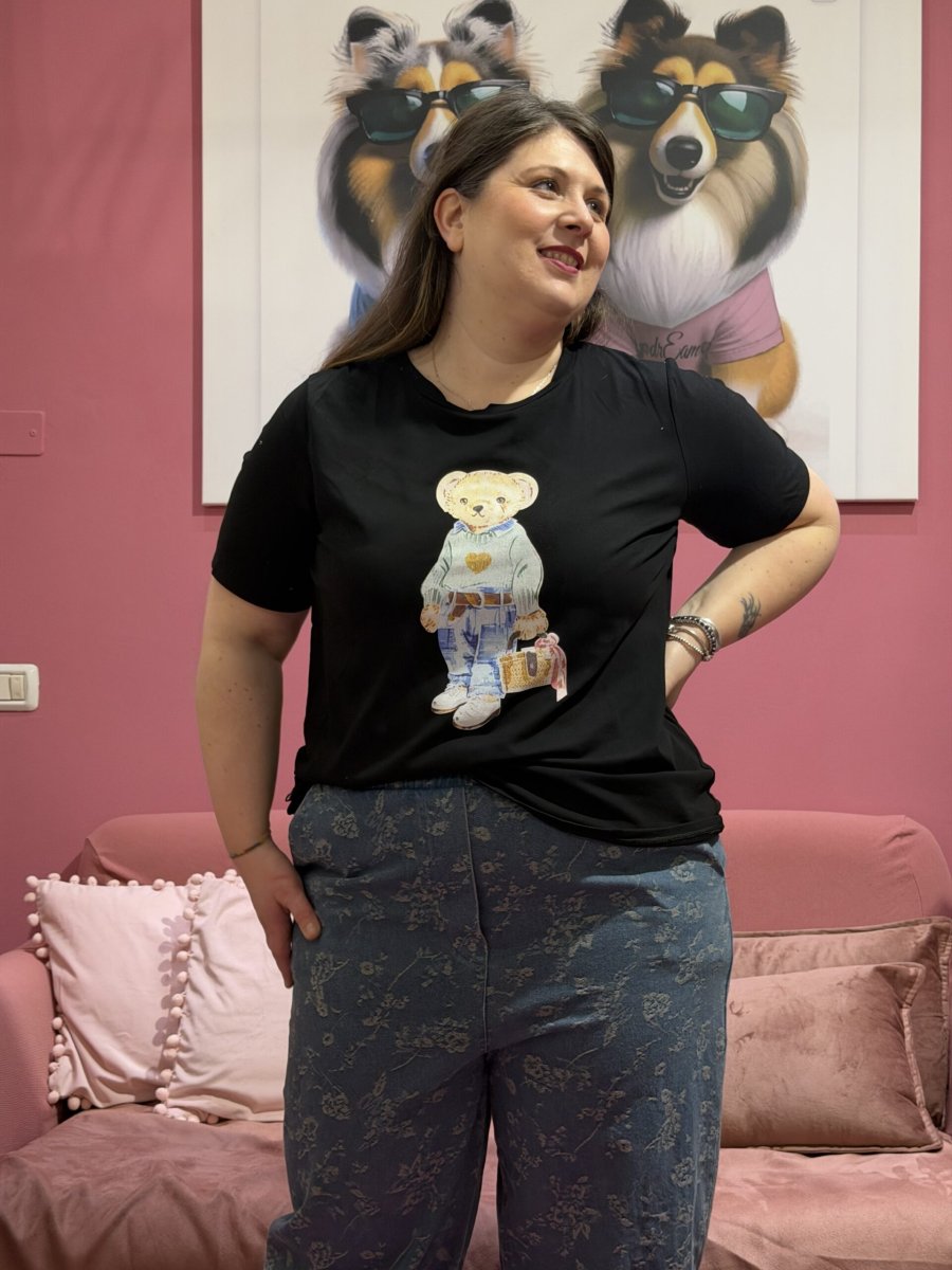 La nostra t-shirt Linea Dream Curvy con stampa orsetto è il mix perfetto tra tenerezza e carattere. Il dettaglio grafico centrale rende il capo protagonista, mantenendo però uno stile facile da abbinare e portabilissimo ogni giorno.
