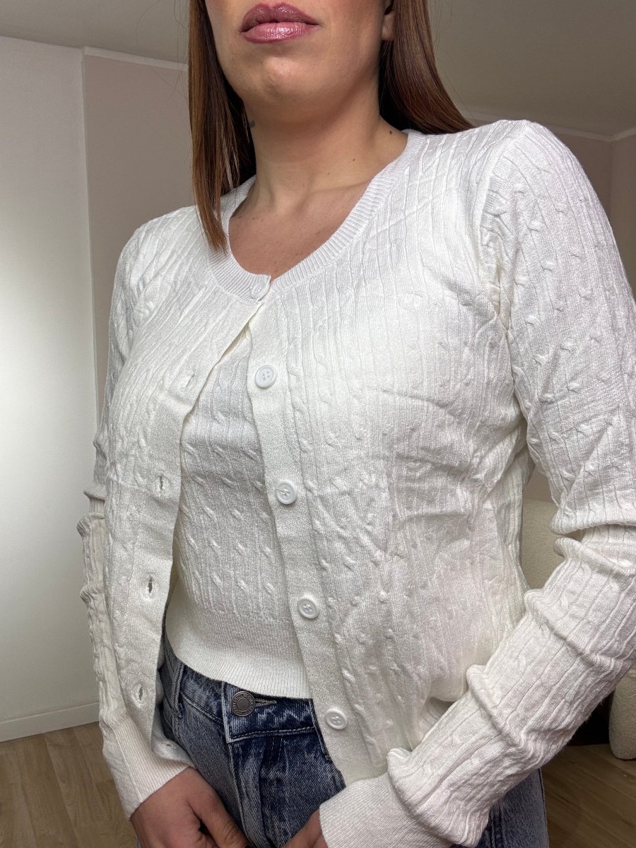 Twinset composto da top e cardigan con trama intrecciata, in lana rasata. Veste fino a una taglia 46